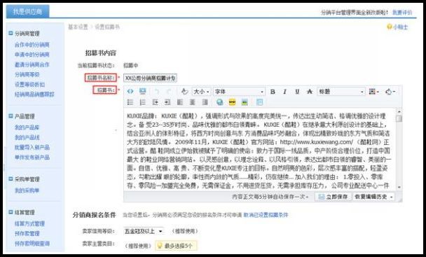 登陆分销平台,进入“基本设置”—“设置招募书”,输入招募书名称及招募书内容: