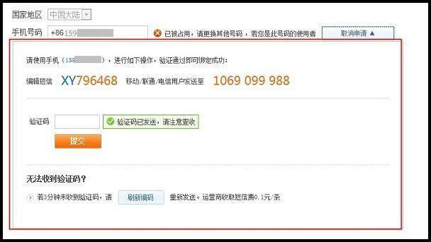 点击申请绑定此号码后出现下图: