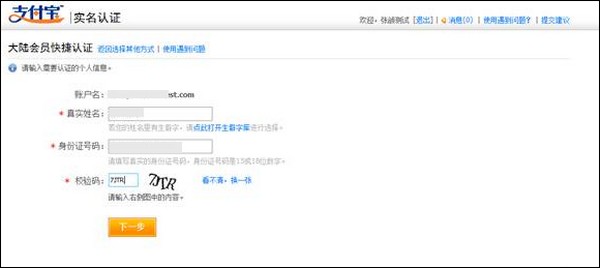 4、填写认证用户的姓名及身份证证件号码,点击【下一步】;