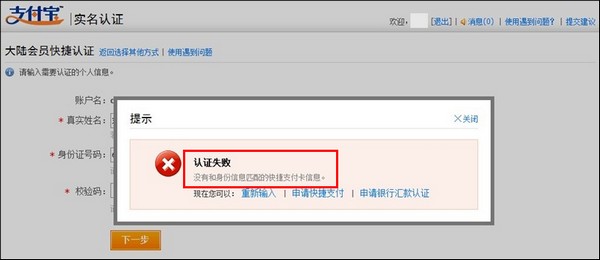 6、如填写的姓名和身份证信息不符的,页面会提示认证失败:没有和身份信息匹配的快捷支付卡信息。