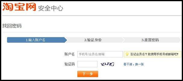 第二步:进入安全中心,输入账户名和验证码,再点击“下一步”;