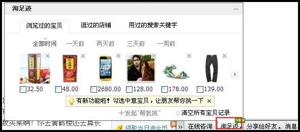 要查看我浏览过的宝贝和店铺,您可以在我的淘宝页面右下方的淘宝工具条中,点击“淘足迹”即可打开查看到您之前浏览过的宝贝及店铺等,您可以根据时间选择查看,浏览宝贝记录较多时,您可以点击右侧的箭头翻看哦~