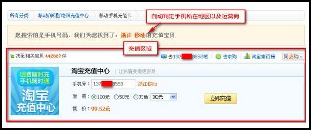 淘宝搜索功能会智能地帮您判断出手机的所在地和网络。选择充值面值后点击“立即充值”即可。