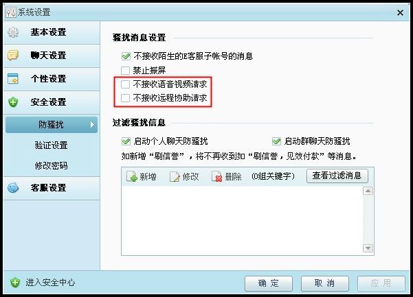 不想在阿里旺旺上接收语音视频和远程请求,请您打开阿里旺旺卖家版界面,点击阿里旺旺右上角“主菜单”-“系统设置”-“安全设置”-“防骚扰”中,勾选“不接收远程协助请求”,“不接收语音视频请求”,最后,点击“应用”,可以有效防止被恶意骚扰哦!