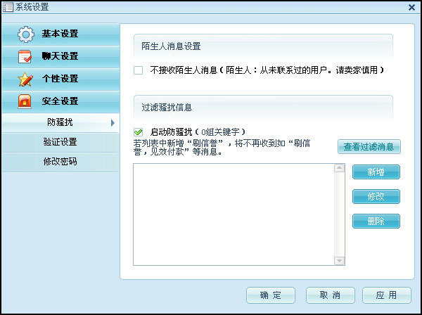 如果有很多垃圾消息有相同的关键字,如“刷钻”等,设置后包含此关键字的旺旺消息不会提示和在对话框显示,可以到“查看过滤消息”中查看。
